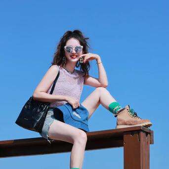 🌈出行游玩新风尚!淡紫色网格背心,温柔又浪漫,搭配高腰牛仔短裤,毛边设计个性十足,拉长腿部线条,尽显青春活力。脚下短靴配彩色拼色短袜,色彩碰撞间透露着不羁与趣味,每一步都踏出时尚态度。👢